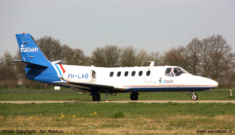 | PH-LAB is the flying asset of the Dutch National Air and Space Laboratory Foundation, or in Dutch; Stichting Nationaal Lucht en Ruimtevaart Laboratorium, and is based at Schiphol- Oost. The Citation named "Professor H.J. van der Maas" also sports "Delft University of Technology" titles and on the tail the TU LR-logo: Technical University Lucht en Ruimtevaart. |
