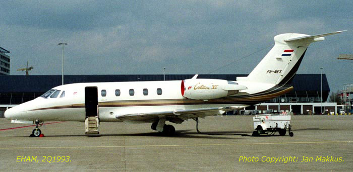 | PH-MEX was registered to Martinair Holland on 15 July 1992. After eight years, on 20 Februari 2001 the Citation was transferred to Excellent Air. On 15 December 2004 the Citation was transferred to Jet Netherlands BV, and one month later, on 13 January 2005 it was transferred to Jet Management Europe BV. One year later, on 18 January 2006 PH-MEX was transferred to SolidaiR from Eindhoven. Solidair was declared bankrupt on 7 October 2011 and PH-MEX was transferred to Fleet Lease BV, Rijssen on 1 November 2011. On 9 March 2012 PH-MEX was transferred to ASL BV, Eindhoven. After almost 22 years, on 30 June 2014 PH-MEX was cancelled from the Dutch register and exported to Kenya. New tail-number is 5Y-YAH. Lateron to 9H-PLM and HA-SCU. Previous tailnumber is: N217CM. |